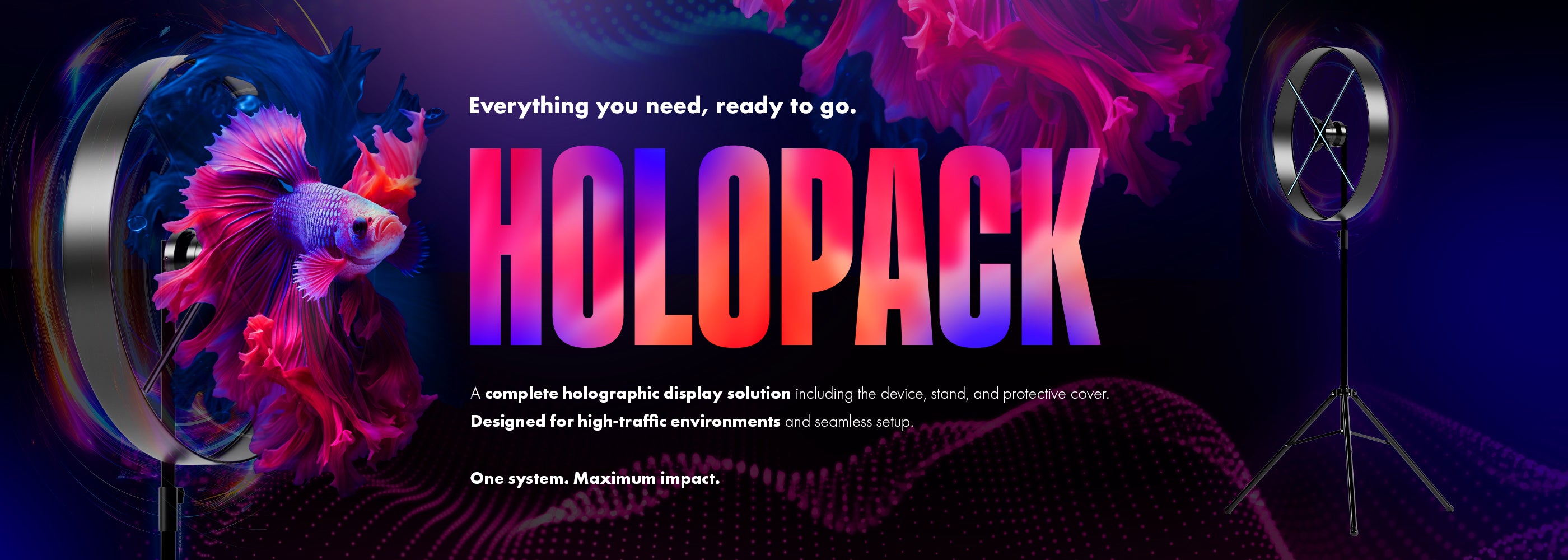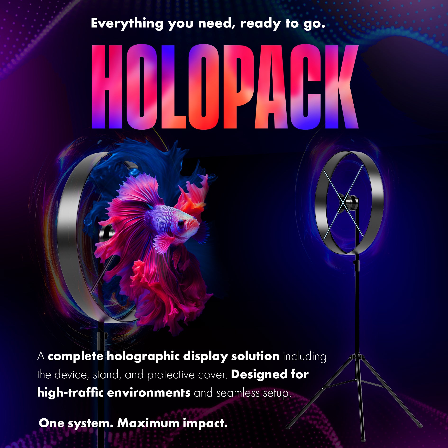 Meet the HOLOPACK — the complete holographic display solution built for instant impact. Each pack includes your chosen Holofex fan size (56cm, 70cm, 85cm, or 100cm), our premium tripod stand, and a protective cover — everything you need in one sleek kit.